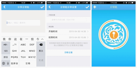 当你收到短信后,点击云钥匙分享功能,输入密码(下左图,初始密码是123456),然后设定分享钥匙的开门次数和有效期(下右图),就可以让亲朋好友的手机也能开门了,不过他们的界面里只有开锁按钮没有功能界面(下右图),当有效期过期或者开门次数达到后,云钥匙就自动失效了。