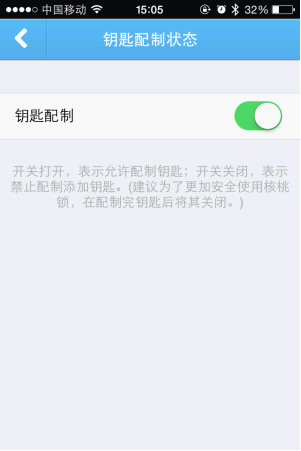 钥匙配置按钮控制核桃锁是否能被手机通过扫描二维码配置钥匙,建议当家人都配置好核桃锁钥匙后把它关闭(如下图)。