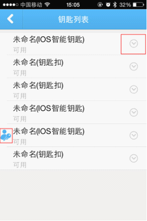 钥匙列表按钮里可以看到现在拥有核桃锁对应的所有手机钥匙和钥匙扣(如下图),左边红框里的是你现在使用的手机钥匙,在这里,你可以点击钥匙右方箭头对这些手机钥匙进行重命名和删除,就算手机丢了也不用怕,只要登录另一台有钥匙的手机就可以把丢掉的手机钥匙删除掉。