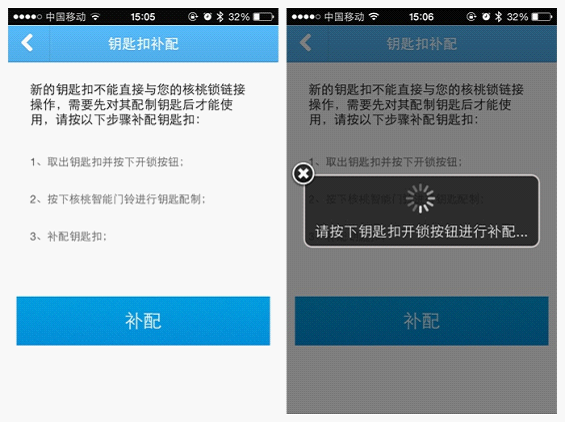 钥匙扣补配按钮是用来配置钥匙扣的,配置好后就可以用钥匙扣来打开核桃锁了,,新买的钥匙扣都需要先进行配置才能使用,过程如下图。