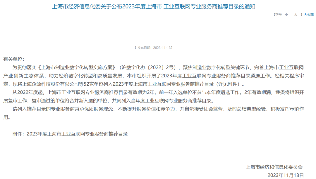 近日,上海市经济和信息化委员会公布了2023年度上海市工业互联网专业服务商推荐目录。推荐目录是上海市经济和信息化委员为贯彻落实《上海市制造业数字化转型实施方案》,聚焦制造业数字化转型关键环节,完善上海市工业互联网产业创新生态体系,助力经济数字化转型和高质量发展,在全市范围内遴选一批技术实力雄厚、服务能力优秀、市场反映良好的工业互联网专业服务商而形成的。