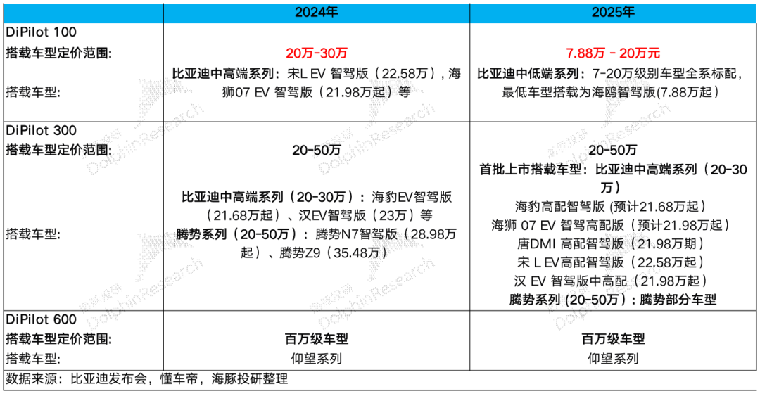 同时从比亚迪智驾三种配置对比于2024年搭载车型价格带的边际变化来看,中高端智驾版本(Dipilot300/Dipilot 600) 搭载车型价格带基本相比2024年无变化;而真正智驾价格带下沉最大的是中低端智驾版本(Dipilot 100),搭载车型定价范围从2024年20-30万元下沉到2025年7万级-20万元,也正是比亚迪销量的基本盘上,低价车型的“智驾下沉”将成为比亚迪2025年最大增量。