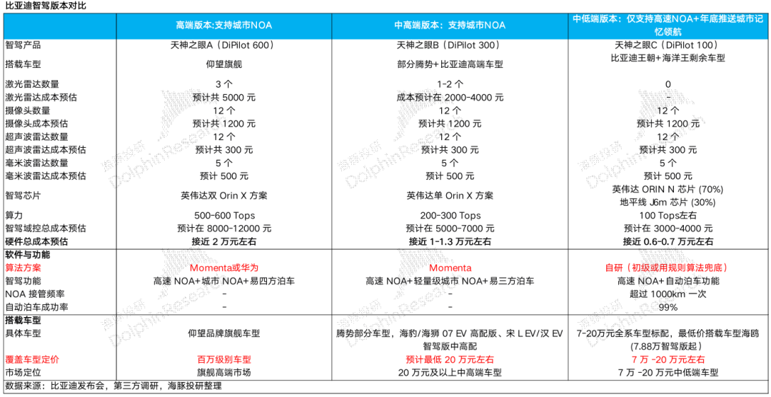 ② 拆分比亚迪三个智驾版本的硬件和软件配置来看(结合第三方调研信息):
