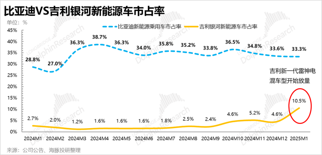 但同行如吉利,在2024年下半年就开始发布此类技术,2024年末就开始了大规模量产(银河星舰7 EMI),成功打造出爆款车型,比亚迪混动技术的代差先发优势已经被同行基本追平,而比亚迪2024年12月和2025年1月销量都不及市场预期,市占率呈现下滑趋势,比亚迪迫切需要新车型的大幅度升级来实现市场份额的防守和进一步扩张。