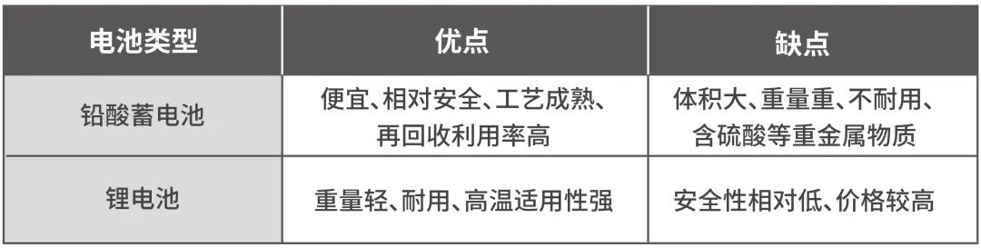 锂电池相比铅酸蓄电池具有重量轻、充放电循环次数多、额定电压高、高温适用性强等优点。不过,其在安全性上存在一些隐患,且价格相对较高。