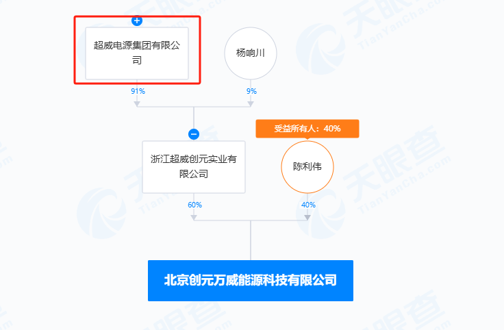 发生故障的这组锂电池,是由浙江超威创元实业有限公司(下称“浙江超威”)生产的,北京创元万威能源科技有限公司是其在北京的经销商之一。通过天眼查的股权穿透可见,这两家公司的背后控股股东均为超威集团。