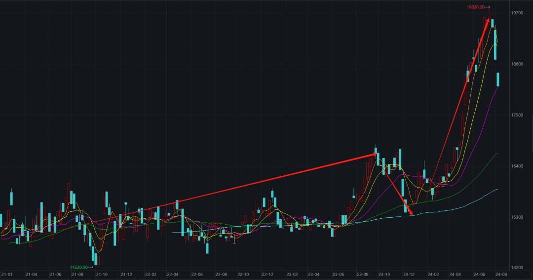 2021年初时,铅现货价格在14500元/吨左右,但是经过一段时间的区间震荡后,在2023年10月涨至16800元/吨,短期调整后延续上行,直到今年7月中旬,创造了19820元/吨的历史新高。