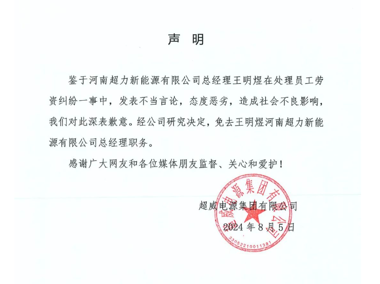 随着事件的发酵,超威集团8月5日发布声明,免去了王明煜的总经理职务,并对事件造成的社会不良影响表达了歉意。天眼查显示,河南超力注册资本6857万元,实控人为持股占比65%的超威电源集团有限公司。