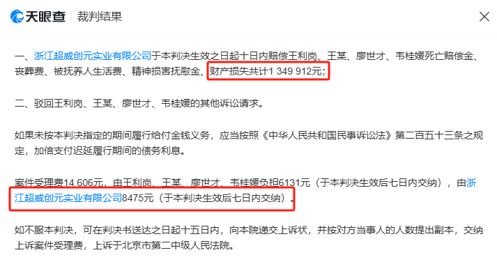最后经法院判定,虽然电池充电故障是火灾的直接原因,但王某和廖某在充电过程中存在不当操作,且廖某在逃生后又返回火场的行为增加了自身风险。因此法院判决廖某对自己的死亡承担40%责任,并判决浙江超威赔偿王某一家财产损失134万余元以及承担部分案件受理费。