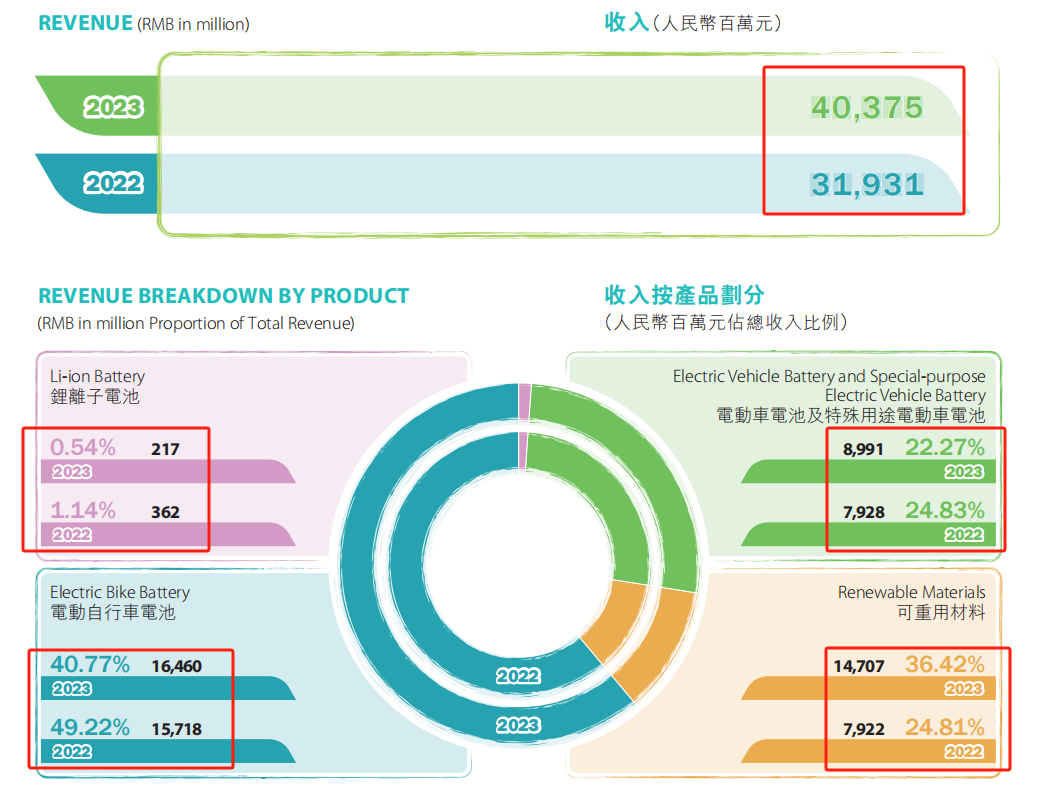 2023年,超威动力实现营收403.75亿元,较2022年时的319.31亿元增长了26.44%。在超威的四大业务线里,除了占比最低的锂离子电池营收有所下滑以外,其他三个业务线的营收均实现了不同幅度的增长。