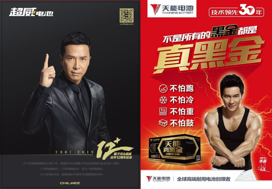 同在一个县城的超威与天能,可谓“一山二虎”。双方经历了长达十几年的激烈竞争,将战火烧遍广告、渠道、电商等多个领域。在代言人身上,超威引进了功夫明星甄子丹,而天能则引入了综艺明星李晨。