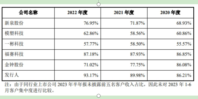 虽然江苏永成认为,自身客户集中度较高的特点与行业整体是保持一致的。但是,财闻网了解到,江苏永成的这种说法似乎站不住脚。因为从同行业可比公司新泉股份、模塑科技、一彬科技等发布的相关数据来看,基本没有一家企业像江苏永成一样对大客户如此依赖,没有一家同行企业跨过收入占比超九成的“门槛”,多数在50%-80%多之间浮动,那么,这样看来,江苏永成又是如何做到所谓和行业保持一致的呢?