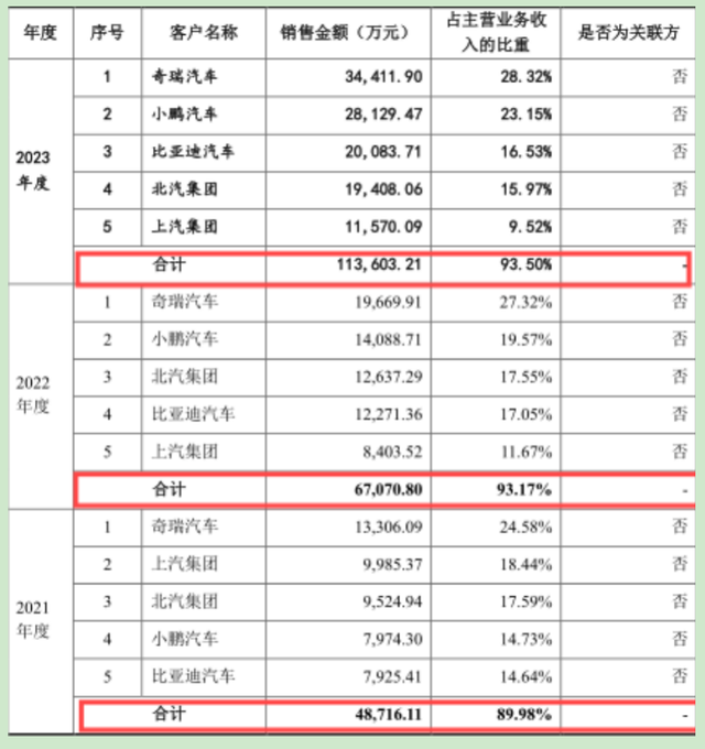 招股书显示,近三年来,江苏永成前五大客户的销售收入呈现爆发式增长态势,如2021年,前五大客户奇瑞汽车、小鹏汽车、北汽集团、比亚迪汽车、上汽集团五家公司合计贡献营收48,716.11万元,到了2022年,上述五大客户已经为江苏永成带来了6.7亿元收入,到2023年,这一数据进一步增长到11.36亿元。