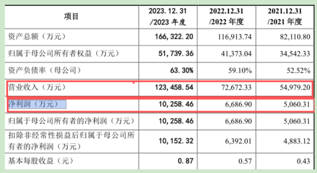 借助我国汽车产业的高速发展,近年来江苏永成业绩取得了高速增长,招股书显示,报告期内(2021-2023年),江苏永成分别实现营业收入5.49亿元、7.26亿元、12.34亿元;分别实现扣非净利润0.5亿元、0.66亿元、1.02亿元,业绩处于持续高速增长态势。