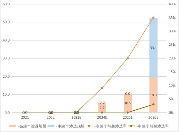 基于中国汽车工业协会统计数据测算,预计2024/2025/2026年全国汽车出货量约为2500/2620/2755万台,其中高端车占比约2%-3%。按照NTN卫星直连模组在高端车型前装渗透率逐步提高的趋势,2024年预计采用NTN技术的汽车直连卫星的高端车型渗透率预计达5万台,到2026年约为52.3万台。NTN汽车直连卫星功能前期主要搭载在高端车型为主,预计2026年逐渐拓展中低端车型。