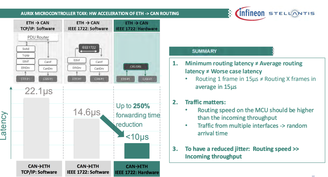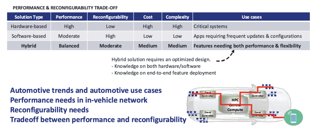 ◎ 混合方案则结合了两者的优势,在AURIX TC4X微控制器中通过硬件处理实时路由任务,同时由软件负责策略更新与功能迭代,实现了微秒级的低延迟与快速适配的平衡,这一方案不仅满足了汽车电子系统对高性能与可重构性的双重需求,也为未来的技术扩展提供了坚实的架构基础。