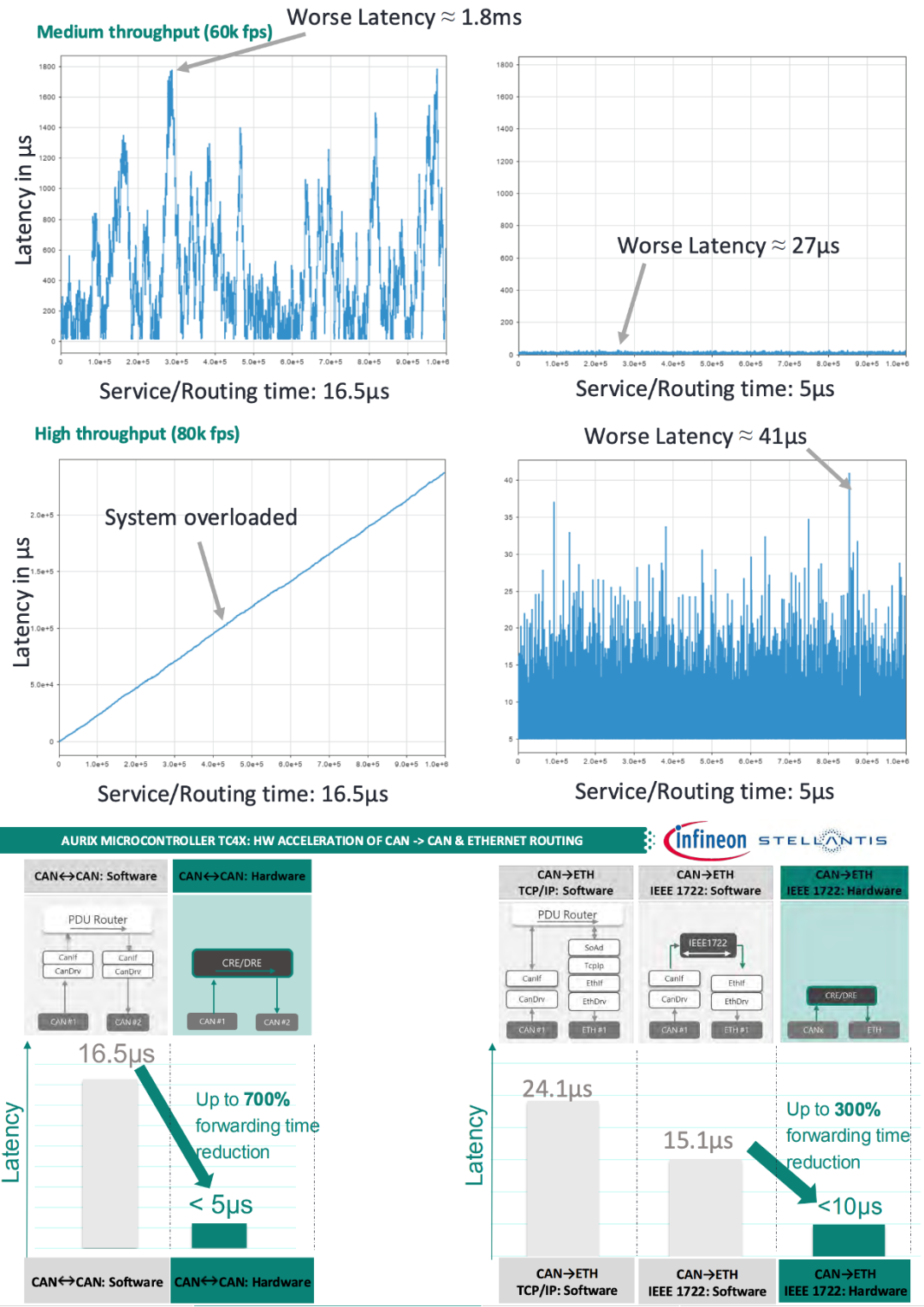 CAN到CAN路由的延迟从16.5微秒降至低于5微秒,提升幅度高达700%,CAN到以太网(ETH)路由基于IEEE 1722协议的硬件加速将延迟降低300%,而以太网到CAN路由通过TCP/IP卸载技术将延迟减少250%,提升了系统的实时性,也为混合流量场景下的性能优化奠定了基础。