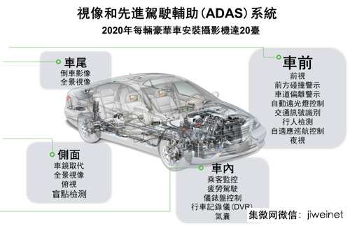 随着消费者的安全意识不断提高,主动安全系统在汽车上的采用持续激增,尤其是采用更智慧的先进驾驶辅助系统(ADAS)配以各种感测器(图2),透过碰撞预警、车道偏离警示、自动远光灯控制、交通讯号识别、行人检测、自适应巡航控制、夜视等功能提升行车安全。