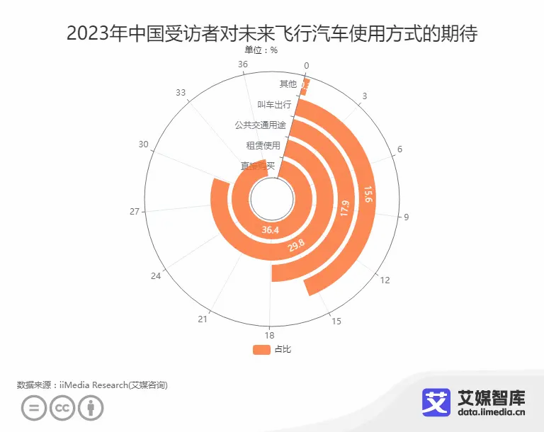 从数据来看,当前消费市场对于飞行汽车这一新概念的接受程度还是较高的,iiMedia Research(艾媒咨询)数据显示,85.8%中国受访者表示未来愿意尝试飞行汽车产品及服务,其中36.4%的受访者偏向直接购买飞行汽车,29.8%的受访者偏向租赁飞行汽车。