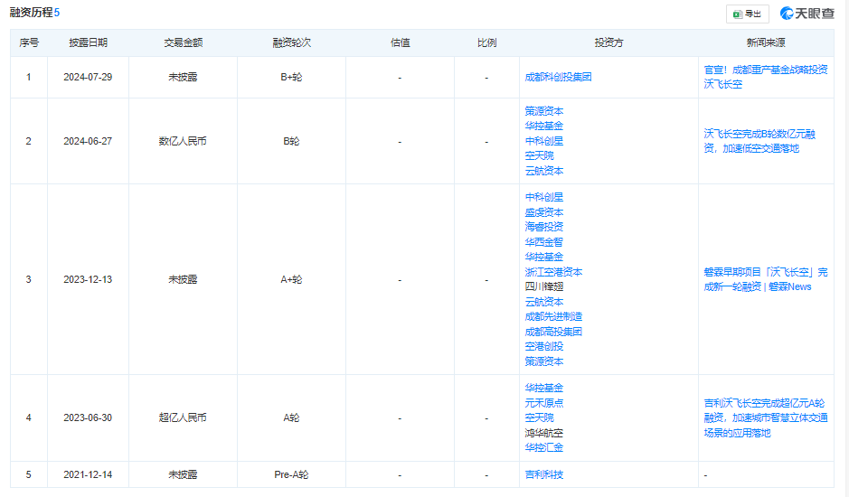 而据沃飞长空微信公众号7月29日消息,成都科技创新投资集团下属成都市重大产业化项目投资基金也官宣了对于沃飞长空的B轮投资。天眼查显示,成立至今,沃飞长空已经总共完成5轮融资。