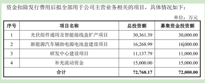 据招股书,泽润新能专注于新能源电气连接、保护和智能化技术领域,专业提供光伏组件接线盒产品一体化解决方案。此次IPO,泽润新能拟募集72,000.00万元用于“光伏组件通用及智能接线盒扩产项目”“新能源汽车辅助电源电池盒建设项目”“研发中心建设项目”以及补充流动资金。