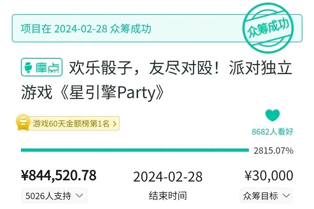这一设计思路让玩家感到兴奋。因此,在游戏陷入资金困境众筹时,5000名以上的玩家在30天内共为其募集资金844520元,让《星派对 Party》成为众筹榜第一。