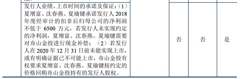 同时,对业绩、上市时间进行了承诺及保证,包括2018年的经审计扣非后净利润不低于6500万元。另外,若发行人在2020年12月31日前未能实现上市,或有明确证据已不可能上市,舟山金投有权要求夏增富、沈春燕、夏瑜键按约定的价格回购股权。