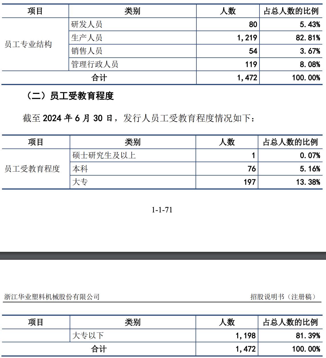 另外,华业塑料的研发人员占公司总人数的比例并不高。截至2024年6月末,该公司的员工人数为1472人,研发人员为80人,研发人员占比仅为5.43%。另外,该公司员工中的硕士研究生及以上学历仅1人,而大专以下学历人员的占比则高达81.39%。