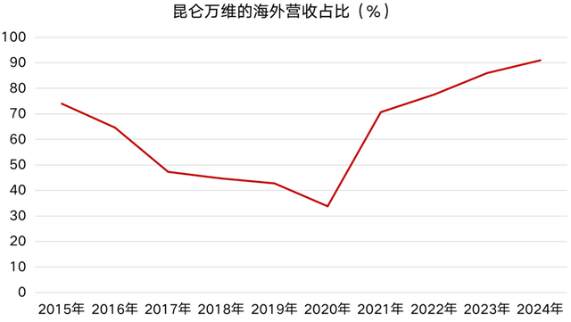 2024年年报显示,昆仑万维的海外收入规模增长至51.5亿元,同比增长21.9%,占总营收的比例达91.0%。