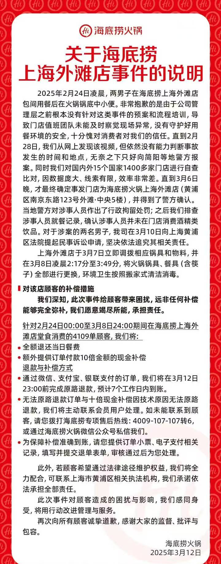 3月12日,海底捞发布关于上海外滩店事件的说明,其表示,针对2月24日00:00至3月8日24:00期间在海底捞上海外滩店堂食消费的4109单顾客,将全额退还当日餐费,并额外提供订单付款10倍金额的现金补偿。