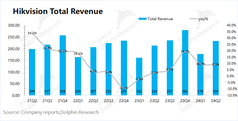 1.1营收情况海康威视在2024年第二季度实现营收234亿元,同比上升9.5%,低于市场预期(250亿元)。公司营收的增长主要得益于创新业务的增长带动。