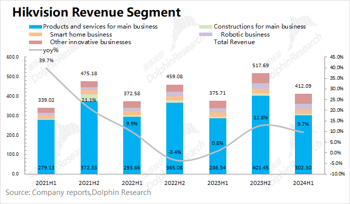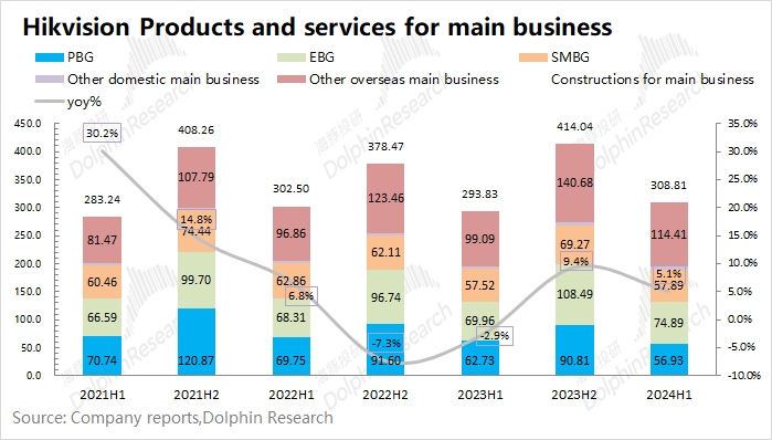 2.1.主业产品及服务海康威视的主业产品及服务业务在2024年上半年实现营收308.8亿元,同比增长5.1%。整体表现:在境内的主业产品业务中,2024年上半年三大事业群整体表现开始向好。①境内公共服务事业群(PBG)同比下滑9.2%,持续下滑;②大企业的境内企事业事业群(EBG)同比增长7%;③境内中小企业事业群(SMBG)同比增长0.6%。