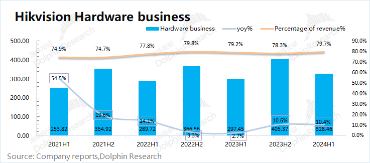 3.2硬件端在测算出软件附加值后,通过公司年度总收入,可以得到海康威视的硬件端收入。2024年上半年海康威视的硬件端业务收入为328.5亿元,同比增长10.4%。对比海康威视软硬件收入增速后发现,公司在上半年硬件和软件增速都有所回落。经济面的变化对于软件端的影响更大,而硬件端基本都维持增长的表现。整体来看,硬件端采购的抗风险性更好,但软件赋能有助于提升公司的盈利能力。然而当前整体需求的回暖偏弱,公司硬件端能带动收入增长,但利润端表现仍旧疲软。