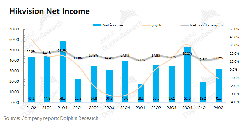 1.4 归母净利情况海康威视在2024年第二季度实现归母净利31.5亿元,同比下滑10.7%,低于市场预期(40.3亿元)。其中公司本季度公司净利率14.6%,同比下滑3.2pct。境内三大事业部的低迷表现,影响了公司最终的业绩表现。