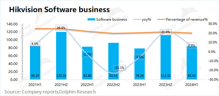 2024年上半年国内三大事业群整体表现依然相对低迷。大中型企业群(EBG)和中小企业事业群(SMBG)有所增长,但幅度不大,而境内公共服务事业群(PBG)更是出现了接近两位数的下滑。而创新业务在上半年增速仍有26.1%,境内外创新业务增长表现都不错。三、软硬一体化:软件占比继续下滑。从只卖监控的硬件厂商转型到具有软件赋能的安防龙头以来,公司一直保持着软硬一体化的经营模式。海豚君通过测算2024年上半年公司软件业务在收入占比下滑至20%。软件业务和硬件业务的增速本季度都有所下滑,但软件业务的抗风险能力明显偏弱。