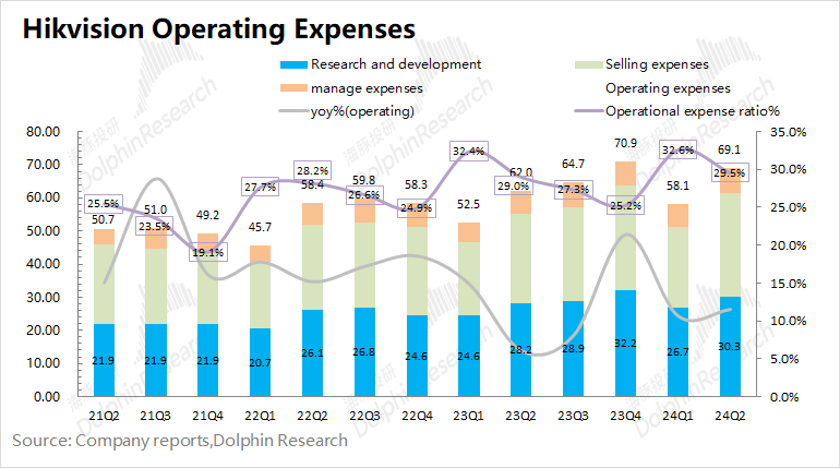 1.3 核心费用情况海康威视的核心费用情况主要有销售费用、管理费用和研发费用。海康威视2024年第二季度三项核心费用合计69.1亿元,同比增长11.6%。三项核心费用率达到29.5%,同比略有提升。1)销售费用:本季度公司销售费用31.01亿元,同比增长14.8%。本季度销售费用率 13.3%,同比上升0.7pct。公司在销售环节投入增加明显;2)管理费用:本季度公司管理费用7.84亿元,同比增长16.7%。本季度管理费用率3.4%,同比提升0.3pct;3)研发费用:本季度公司研发费用30.27亿元,同比增长7.3%。本季度研发费用率 12.9%,同比下降0.3pct。研发费用持续增长,这也表明了公司对研发的重视。以2023年末情况看,公司研发人员数量已经增加至2.8w以上,研发人员的平均工资达到了40万元。