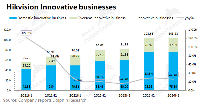 2.2 创新业务公司的创新业务主要包含智能家居、机器人、热成像、存储、以及汽车业务。海康威视的创新业务在2024年上半年实现营收103.28亿元,同比增长26.1%,是公司增长的最主要来源。其中,存储业务和汽车业务增速分别达到65.5%和60.4%。公司本次创新业务在境内外均有不错的增长,细分来看:1)在境内的创新业务中,海康威视2024年上半年实现营收75.89亿元,同比增长25.9%。从营收体量看,创新业务目前仍集中在境内业务为主。2)在境外的创新业务中,海康威视2024年上半年实现营收27.39亿元,同比增长26.9%。