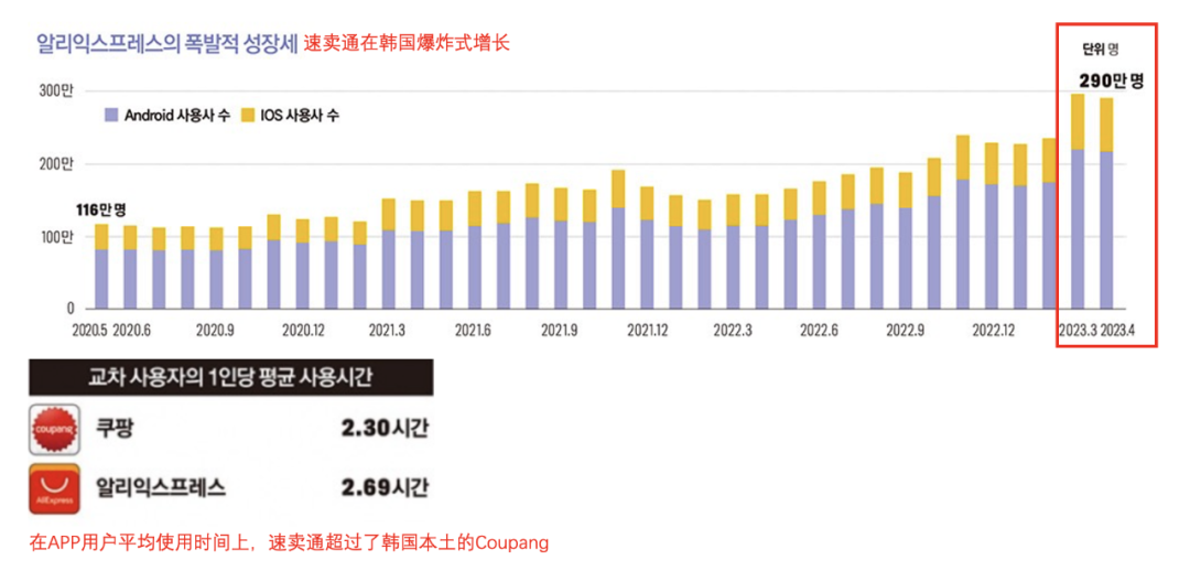 福布斯韩国联合大数据平台IGA Works的分析显示,在AliExpress速卖通和Coupang这两个主要电商平台拥有的250万名交叉用户中,AliExpress的人均使用时间为2.69小时,而Coupang为2.3小时。