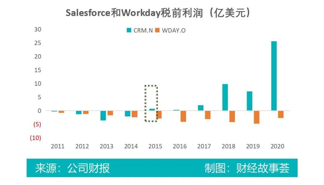 海外CRM客户关系管理系统龙头Salesforce在1999年成立,2004年上市,直到2015年,税前利润才扭亏为盈,此时距离它成立已经过了16年。