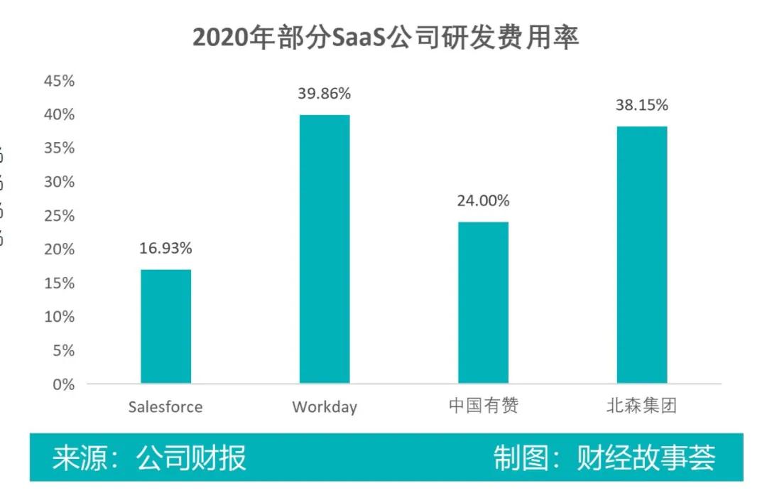 此外,SaaS企业前期投入较高。由于需要提前对软件进行开发及迭代升级,且不同的客户的需求多样化,因此SaaS行业研发投入成本较高。比如,Workday和北森的研发费用率就高达38%。