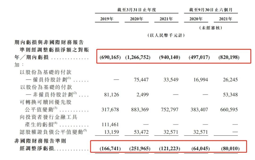 招股书显示,2019-2021财年,北森分别亏损为6.9亿元、12.7亿元以及9.4亿元,而从2021年4月1日至2021年9月30日的六个月内,北森的亏损幅度进一步扩大,达到8.2亿元。经调整后亏损金额为1.69亿元、2.42亿元、1.08亿元和0.83亿元。