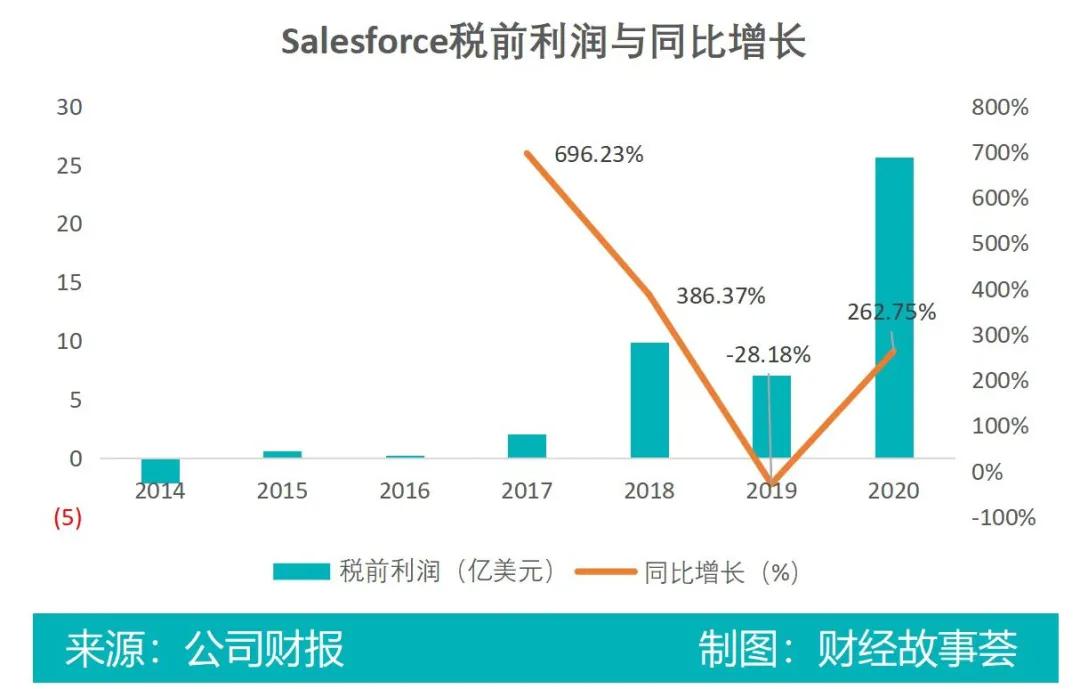 以Salesforce为例,其2015年扭亏为盈后,税前利润高速增长,终于由“躺亏”转向“躺赚”。