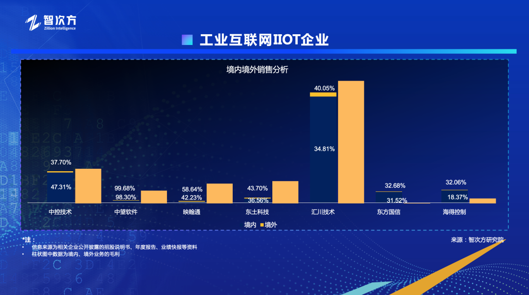 上图显示了工业互联网企业境内和境外销售情况分析,蓝色是境内销售额,黄色是境外销售额(右侧的黄色柱形,单独显示了各个企业在境外的销售情况),柱形图上的百分比数字显示了境内外的销售毛利。