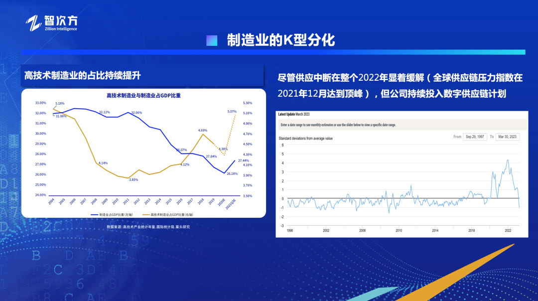 中国制造业正在经历K型分化的过程。数据显示,最近几年,我国先进制造业快速增长,高技术制造业、装备制造业,成为带动制造业发展的主要力量。