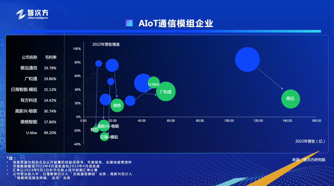 上图是AIoT通信模组企业的营收和增速趋势图。横轴是每家企业2022年的营收,纵轴是营收的增速,气泡大小是企业在2022年4月底和2023年4月底的市值。2021年的营收情况用蓝色表示,2022年的营收情况用绿色表示,我们可以看到每家企业的变化路径。