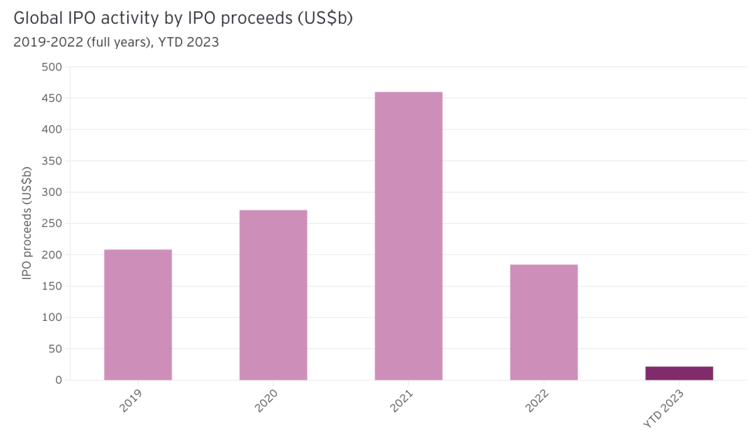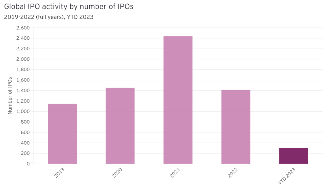 根据安永最新发布的全球IPO统计数据,2023年第一季度,全球IPO交易数量同比下降8%,筹资额同比下降61%。