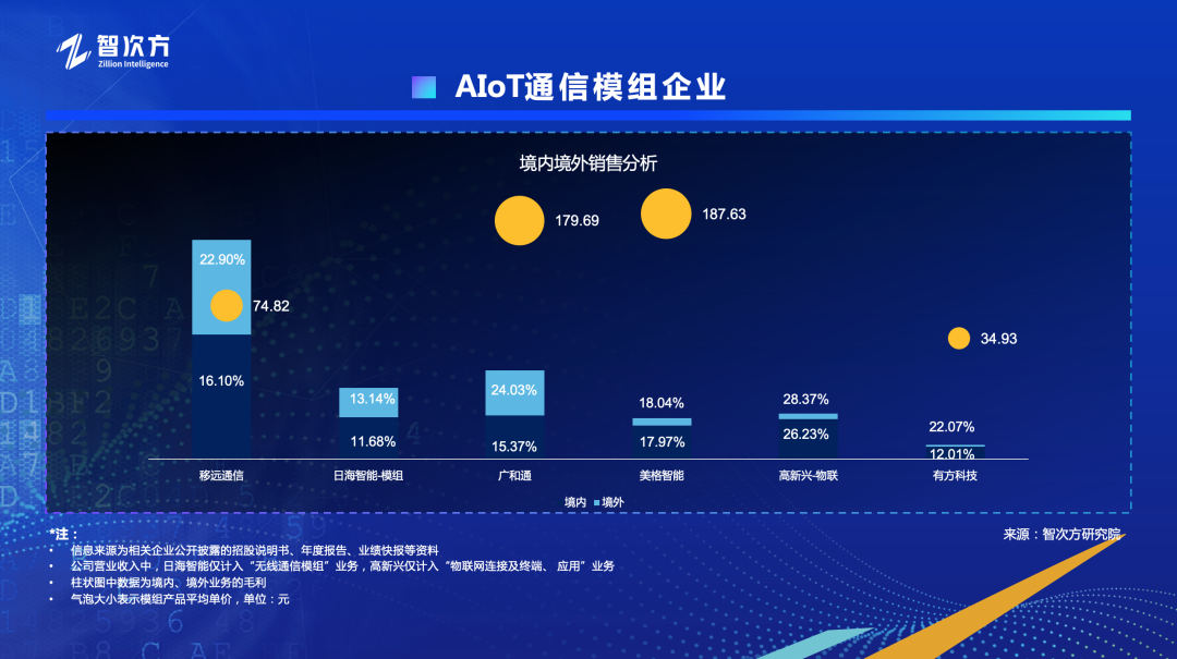 上面的柱状图中,各个企业的境内销售额用深蓝色表示,境外销售额用浅蓝色表示,百分比数值分别对应境内和境外的毛利,气泡大小代表模组产品的平均销售单价。