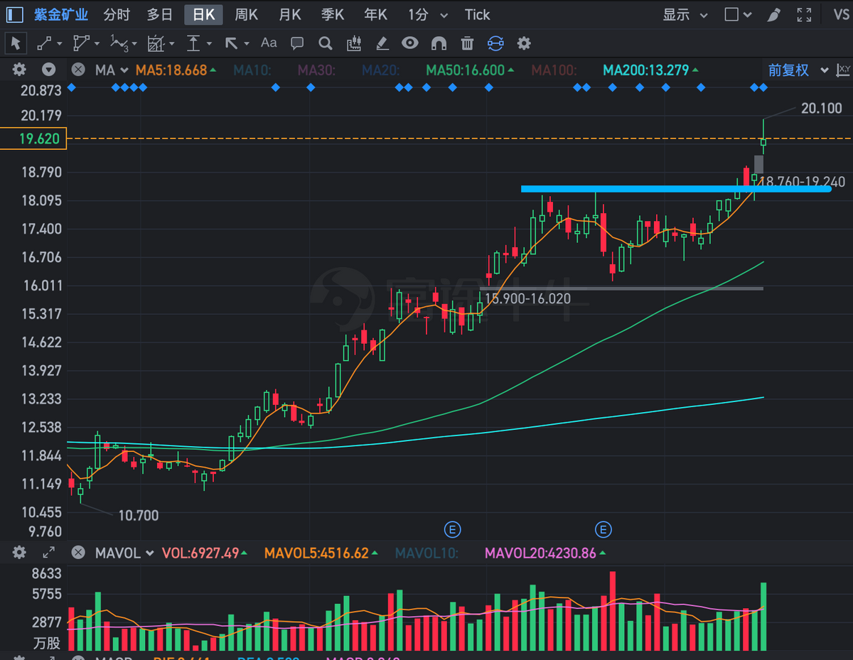 今天表现最抢眼的当属大宗和贵金属板块,龙头紫金矿业(02899.HK)更是暴涨5.55%,股价再创历史新高。高盛也发表紫金矿业的看涨报告,给予紫金H股「买入」评级。摩根大通(JPMorgan)知名量化分析师马尔科科拉诺维奇(Marko Kolanovic)表示,「新的大宗商品“超级周期”已经开始。这意味着大宗商品价格将面临新一轮上涨趋势」。