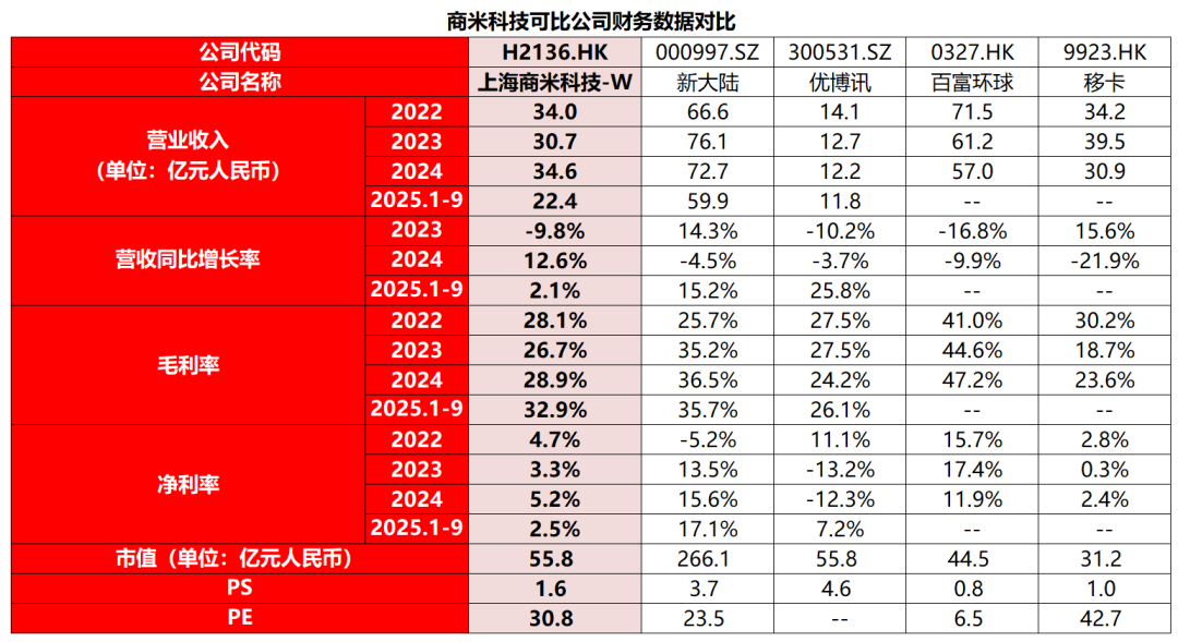 从营收规模看,商米科技 处于行业中游位置,显著低于行业头部的新大陆和百富环球,与移卡体量接近,尚未进入行业第一阵营。