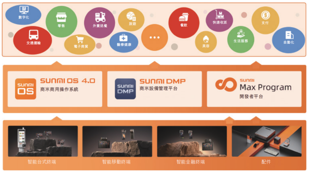 智能设备公司提供一整套智能设备,覆盖15大行业及超过100个细分垂直领域,涵盖餐饮、超市、运动健身、诊所及物流配送等。这一多元化产品组合由公司自研SUNMI OS驱动,专为满足商户在各种商业场景中的广泛应用需求而设计,如下图所示。
